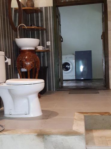 The spacious bathroom will stun you, with its stone bath tub for 2 people (couple), with a huge bay opening on trees and plants. Hot and cold water, shampoo and soap dispenser.