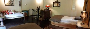 The second floor shelter 2 single beds, has a sitting area with arm chairs on the balcony, antic furniture, paintings and ceiling fanand TV.