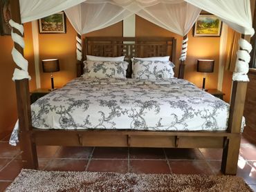 You enter through a protected terrace with sofas. The main bedroom is 25 m2 with a large open bay on the green and 2 windows. Have a king bed, a refrigerator, sitting area and nicely decorated with antics and paintings, fan and some amenities for your comfort.