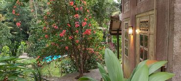 This villa surrounded by plants, flowers and trees is our most recent cottage, built on the remain of an antic Javanese house. You will enjoy its numerous carving and “old living wood”. Facing the river you have direct access to our waterfall dominated by a wooden deck, and the swimming pool. This cottage offer a total privacy. With 2 bedrooms, terrace, kitchen and bathroom the total living area is 90 m2.